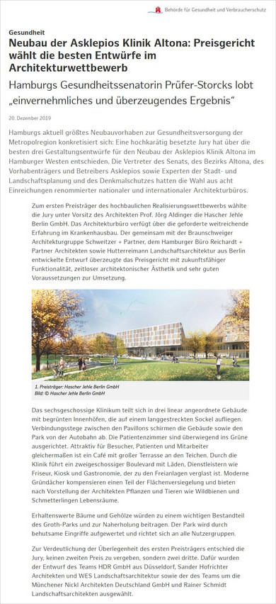 Zum ersten Preisträger des hochbaulichen Realisierungswettbewerbs wählte die Jury unter Vorsitz des Architekten Prof. Jörg Aldinger die Hascher Jehle Berlin GmbH. Das Architekturbüro verfügt über die geforderte weitreichende Erfahrung im Krankenhausbau. Der gemeinsam mit der Braunschweiger Architekturgruppe Schweitzer + Partner, dem Hamburger Büro Reichardt + Partner Architekten sowie Hutterreimann Landschaftsarchitektur aus Berlin entwickelte Entwurf überzeugte das Preisgericht mit zukunftsfähiger Funktionalität, zeitloser architektonischer Ästhetik und sehr guten Voraussetzungen zur Umsetzung.